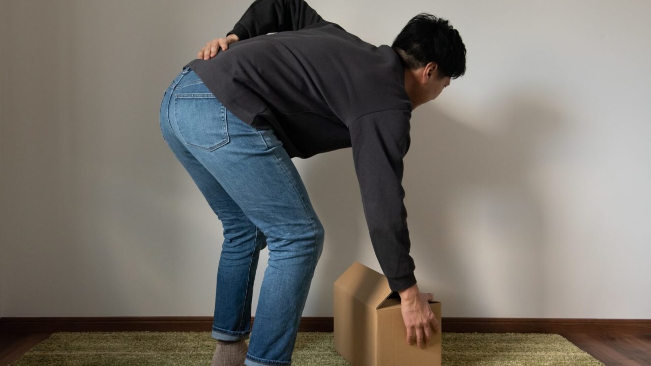 どうしても物を持ち上げなければいけない場合、頭・背中・おしりが一直線になっていることを意識して、しゃがんだ状態から脚の筋肉で立ち上がるように持ち上げましょう。腰への負担を減らすことが大切です。
